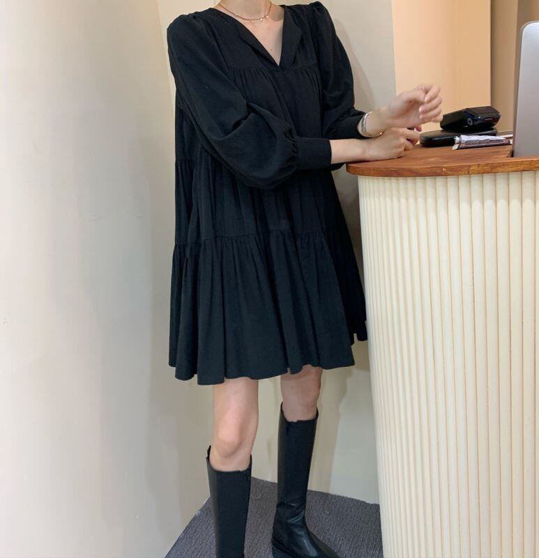 フェミニンなVネックのブラウストップスと、流行のAラインフレアスカートのセットアップワンピース。