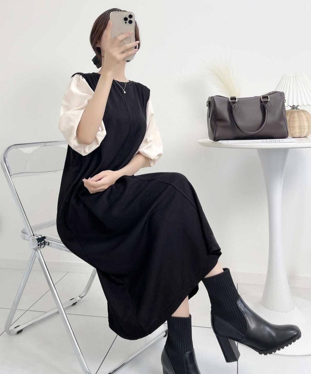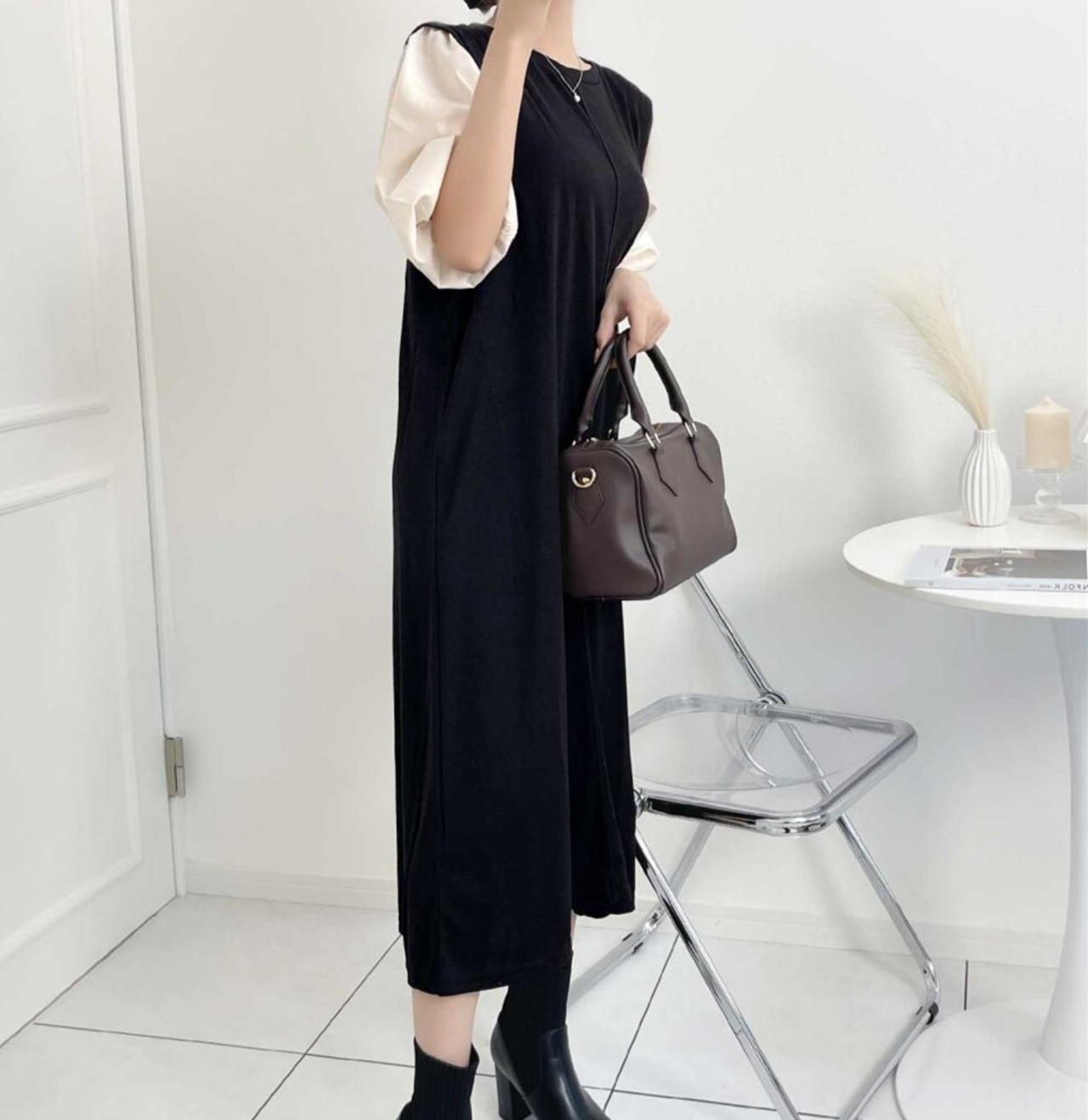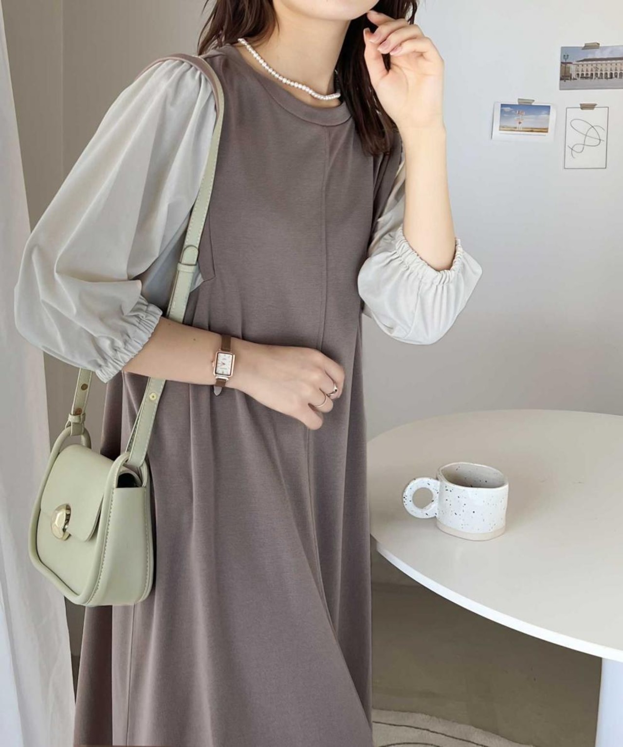 こちらは2024年夏新作のロング丈ワンピース、"ランタンスリーブ"。ラウンドネックと華やかな袖デザインが特徴で、女性らしさを引き立てます。様々なシーンで活躍する一枚です。